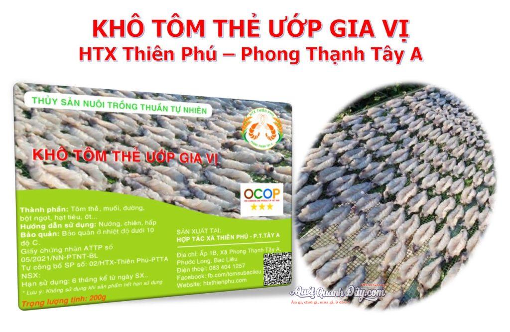 HTX Thiên Phú chúng tôi đã mạnh dạn tìm hướng đi mới cho người dân nuôi tôm thịt của địa phương. Vì vậy chúng tôi đã cho ra đời sản phẩm “Khô Tôm Thẻ ướp gia vị” và đây cũng chính là những con tôm được nuôi trong môi trường tự nhiên, trong vùng nước lợ khu vực mặn – ngọt của huyện Phước Long.